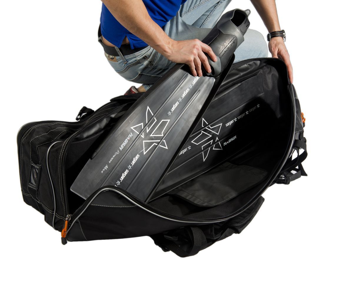 Главная конструктивная особенность – фиксация ласт на средней переборке, превращает ее в ребро жесткости всей сумки, а также исключает перемещение снаряжения внутри сумки во время транспортировки. Дополнительная жесткость задается наружными стяжками с замками «фастекс».